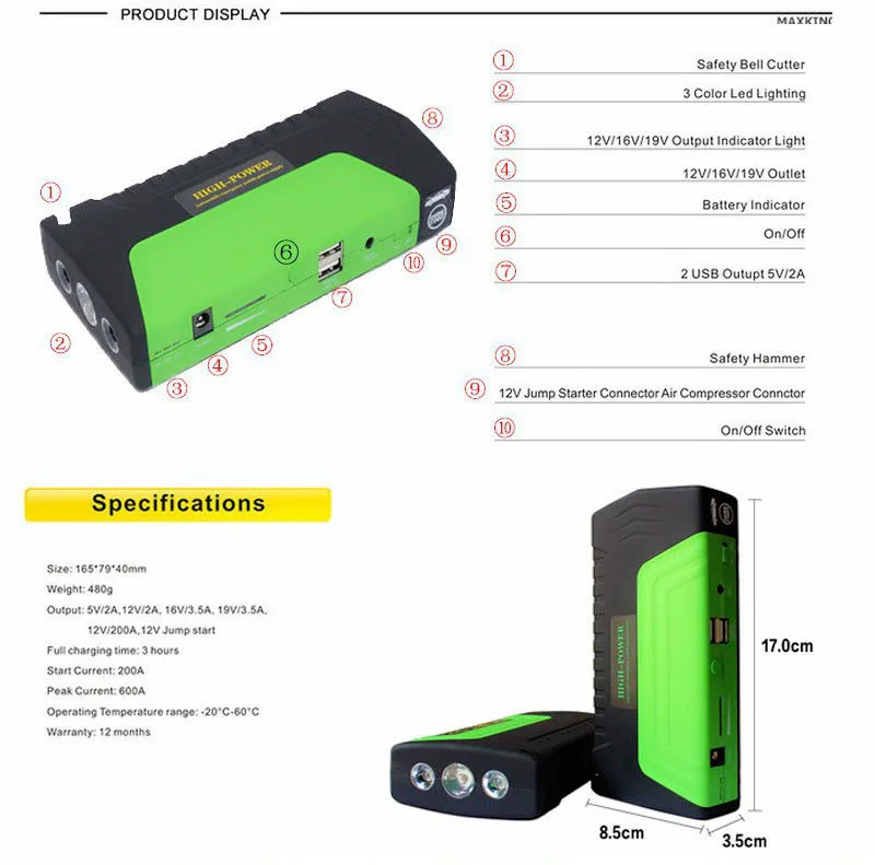 Product Name: 車のジャンプスターター50800 Mah 12ボルト高-容量バッテリー充電器パック用オート車両始動とラップトップ電源銀行多目的球